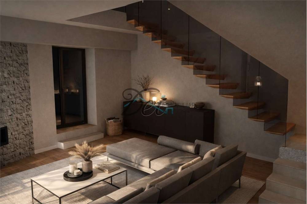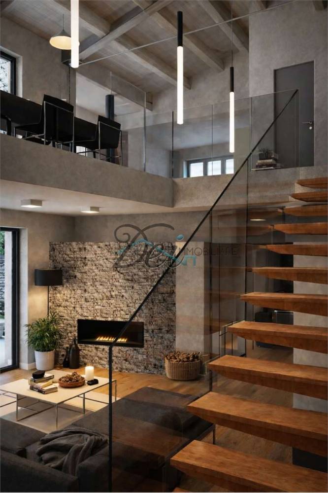 Piano Terra L'ingresso conduce a una luminosa zona living con caminetto a bioetanolo e vista sulla elegante scalinata in legno che porta al primo piano. Il piano terra ospita la camera padronale, completa di bagno con vasca, doccia e locale guardaroba. Completano la zona notte una seconda camera matrimoniale con bagno e una camera doppia con bagno. Dal piano terra si accede inoltre al garage seminterrato di 30 mq.
