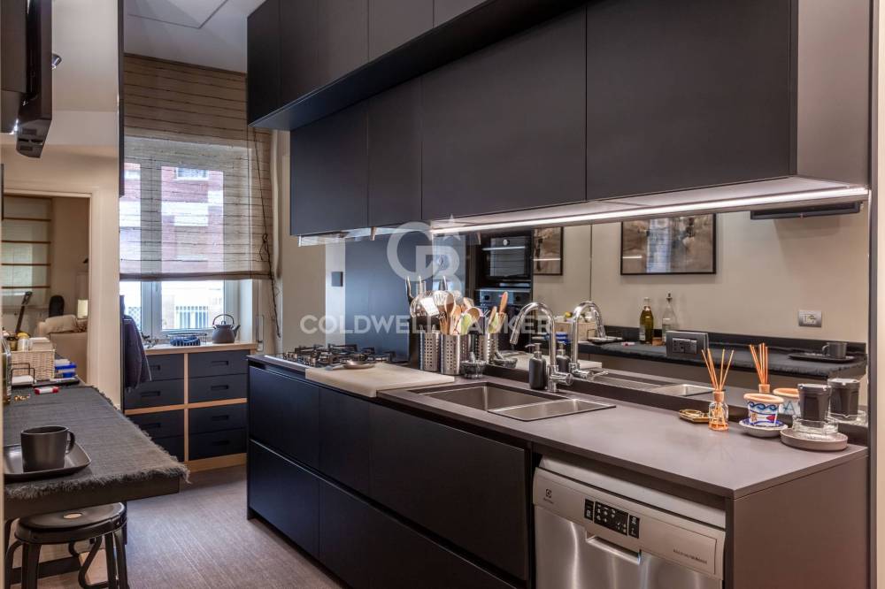 La zona living è composta dal salone ampio e accogliente, impreziosito da una fantastica libreria a muro e da un mobilio ricercato e personalizzato. Il tutto è sublimato da un balcone abitabile, da una raffinata sala da pranzo con un tavolo quadrato di pregio che si fonde perfettamente con gli ambienti facendo da tramite verso la prima delle camere da letto, oggi adibita a studio, e dalla cucina semi-abitabile che, ammobiliata con uno stile moderno e funzionale, è completata da una zona lavanderia separata, pensata per preservare ordine e eleganza negli altri ambienti dellappartamento.