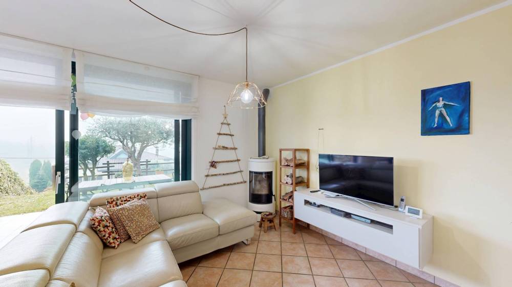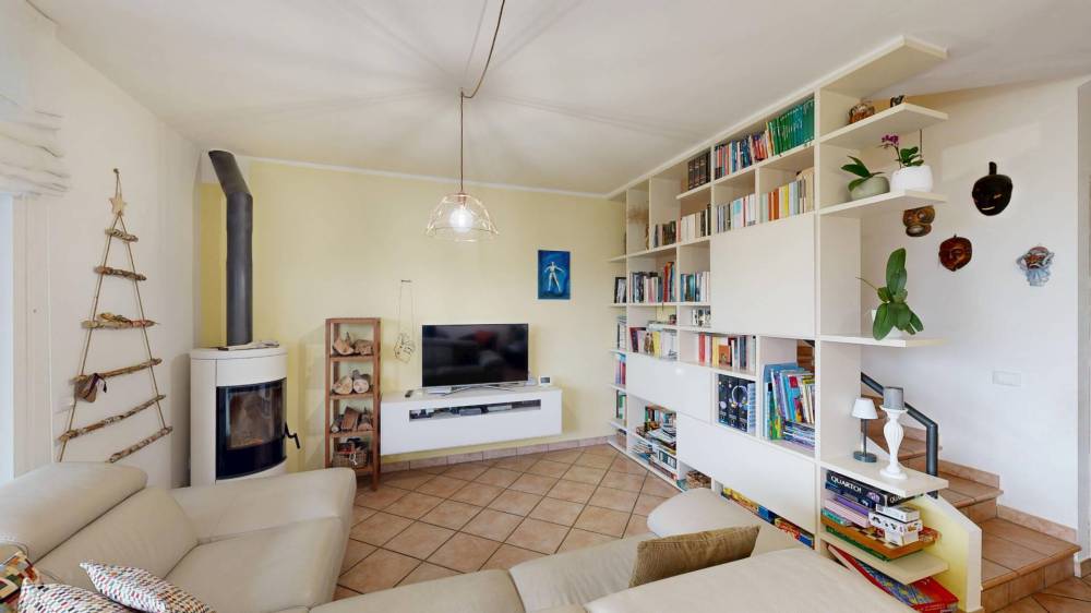 Al piano terra troviamo un ampio soggiorno con camino, caratterizzata da grandi vetrate che donano luminosità e affaccio sul verde. Cucina abitabile accesso diretto al portico coperto con tenda da sole, ideale per vivere lesterno tutto lanno. Completa il piano un bagno di servizio.
