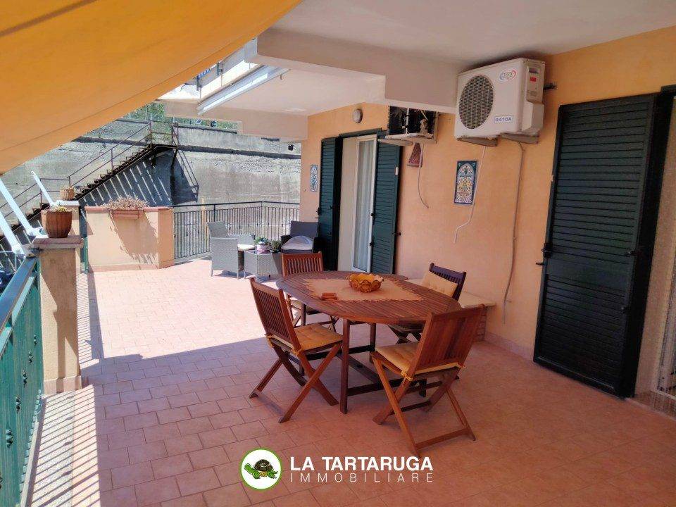 Santa Teresa di Riva - Zona Piazza Mercato a pochi passi dal mare Compl. and quot; I PORTICI and quot;nAppartamento angolare completamente arredato , trlipla esposizione, al primo piano ( con ascensore ) con ampio terrazzo vista mare di mq.90, su cui espongono tutti gli ambienti, composto da:ningresso, ampia zona living con cucina, tre camere da letto, due bagni.nL'unità abitativa è in ottime condizioni, risulta dotata di climatizzatori e Tende da sole.nNella vendita è incluso un posto auto all' interno del complesso di mq.15. - Maggiori Dettagli: Porta blindata