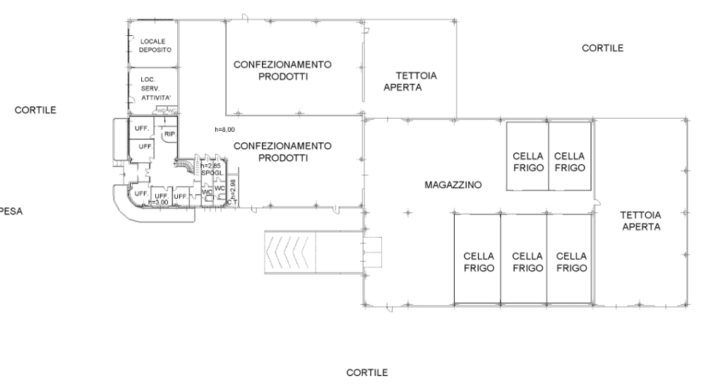 Capannone situato a Castelnuovo Scrivia (AL), il fabbricato ha una superficie di 5.536mq oltre al cortile pertinenziale recintato e una cabina Enel. All'interno il capannone è così composto: al piano terra un ampio atrio, cinque uffici, un ripostiglio, quattro bagni e disimpegni, un locale al servizio dell'attività, due spogliatoi con bagni, un locale di deposito, due locali per il confezionamento dei prodotti, un magazzino, cinque celle frigo, due tettoie e una centrale termica. Al piano primo troviamo una sala conferenze, una sala riunioni, due uffici e un bagno. La superficie esterna al capannone è scoperta ed utilizzabile per parcheggi, zona di manovra, deposito esterno, baia di carico e scarico e pesa dei veicoli.