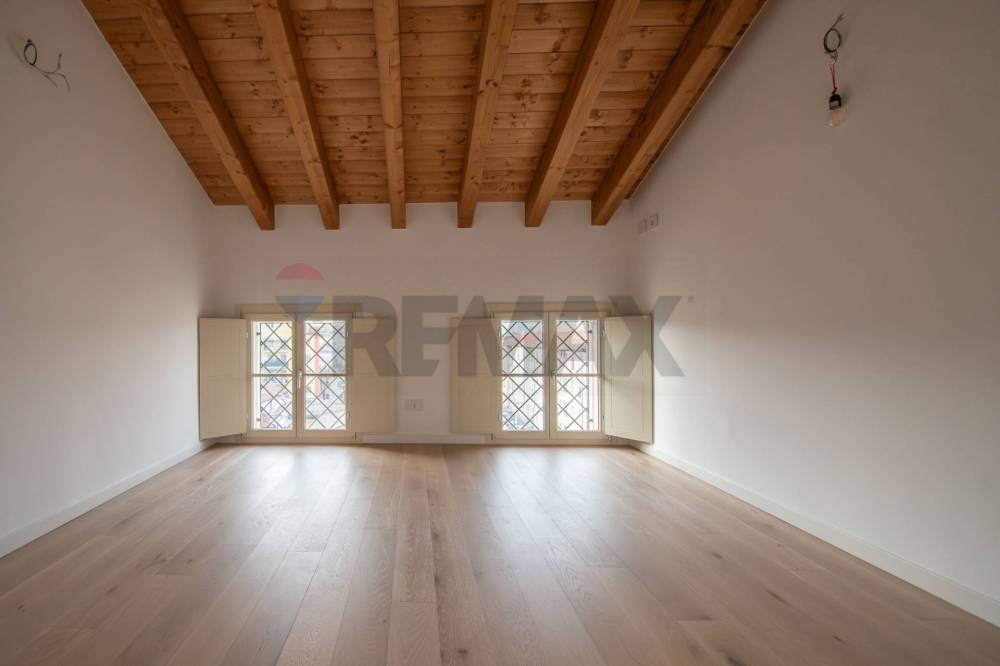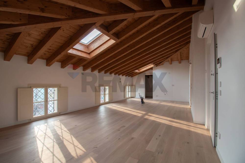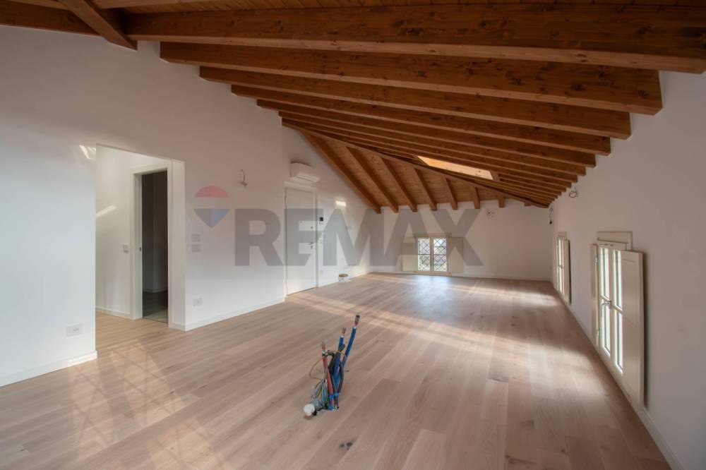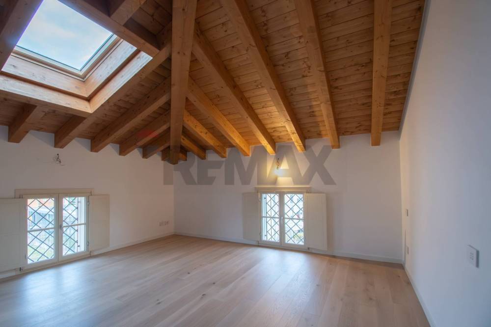 La quadrupla esposizione e le ampie finestrature a 360° garantiscono una straordinaria luminosità in ogni ambiente, mentre i soffitti alti con travi a vista donano carattere, calore ed eleganza senza tempo.
