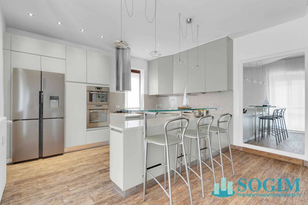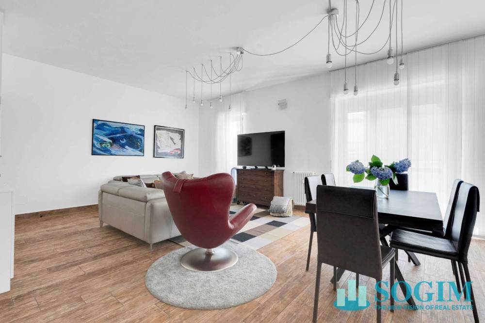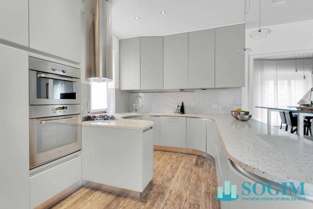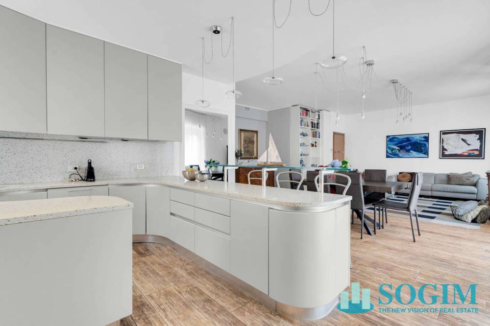 L'appartamento, di 163 metri quadrati commerciali, gode di tripla esposizione nord/est/sud ed è composto da un ampio ingresso che si apre sulla zona living, composta da un luminoso e spazioso soggiorno con cucina a vista marca Pedini. L'ambiente dispone di un balcone dedicato che conferisce respiro e comodità a questa zona dell'abitazione, grazie anche alla posizione privilegiata e non trafficata che garantisce luminosità naturale, tranquillità e privacy, un beneficio nel centro della città.