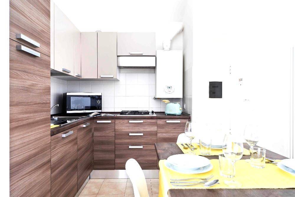 L'appartamento è composto da quattro vani, di cui due luminose camere da letto, un bagno e una cucina a vista, perfetta per chi ama un'atmosfera moderna e conviviale.