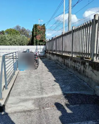 Piccola area urbana facente parte di un edificio residenziale/commerciale; tale area è pavimentata in cemento e viene utilizzata dai condomini come parcheggio per le biciclette.