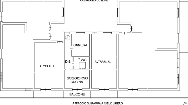 Unità al primo piano composta da un locale soggiorno-pranzo, una camera, bagno, disimpegno e un balcone