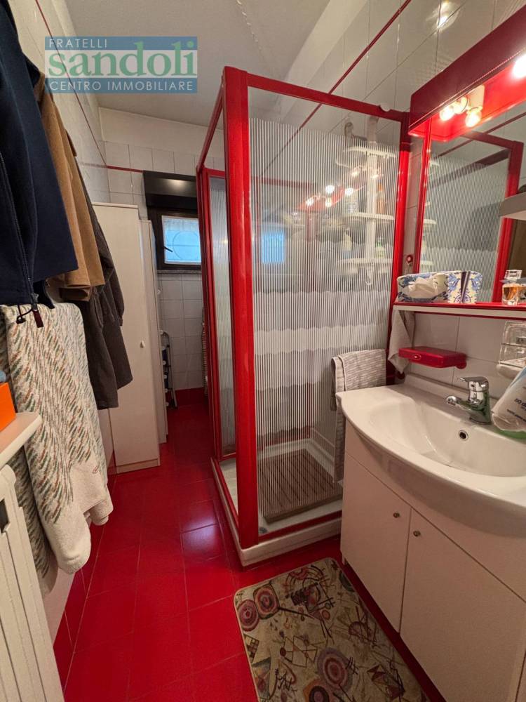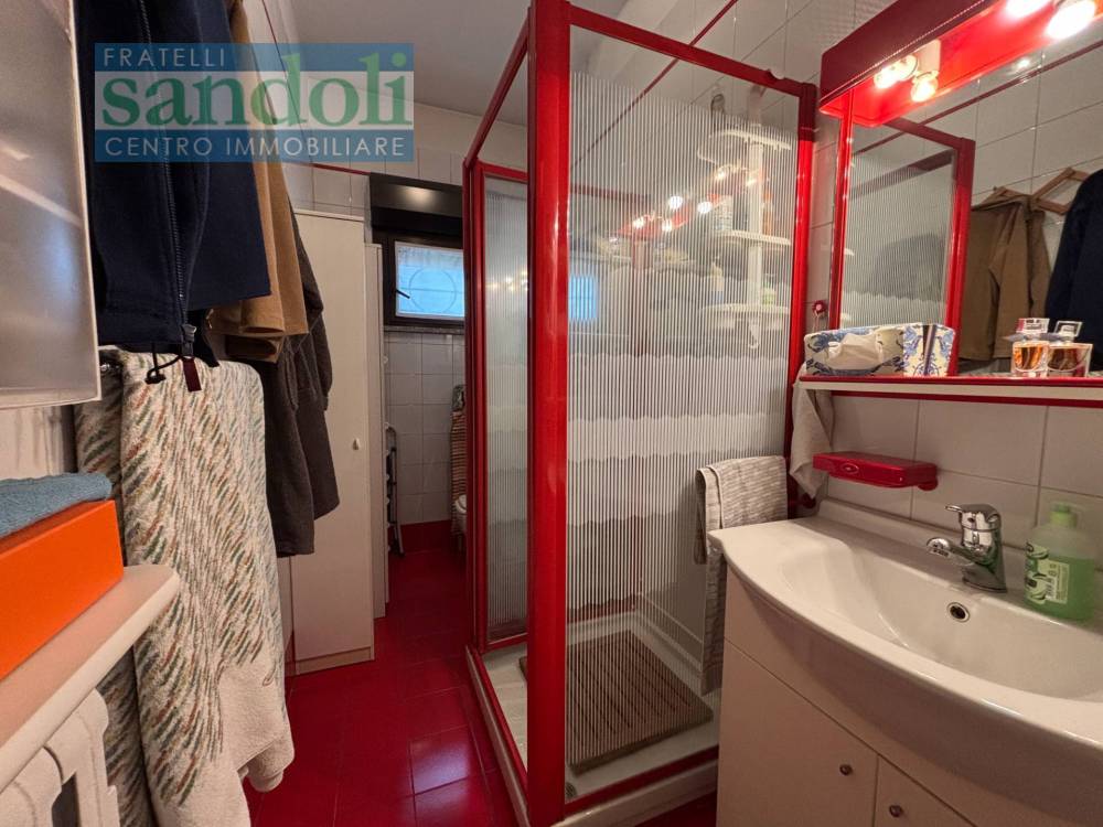 Completa il piano il secondo bagno in questo caso con la presenza della vasca ed ampio mobile in legno con lavandino incorporato.