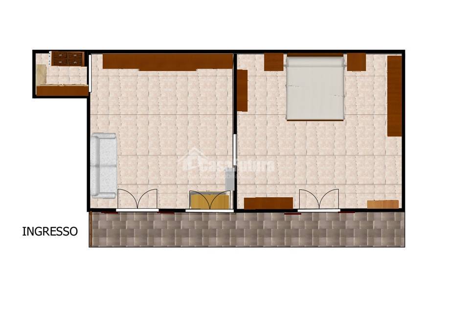 L'immobile si presenta con un ampio ingresso in cucina seguito da una camera spaziosa e luminosa, entrambe con affaccio su un balcone comunicante con esposizione interna, una caratteristica che garantisce silenzio, privacy e tranquillità.