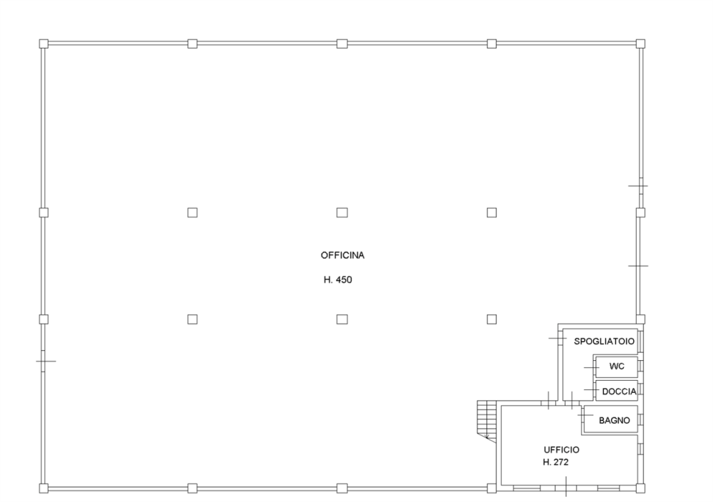 L'immobile è composto al piano terra da ampio locale officina, attigui uffici e servizi con spogliatoio e sovrastante ripostiglio raggiungibile da scala in legno per una superficie di circa 1054,50 mq.