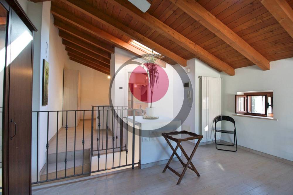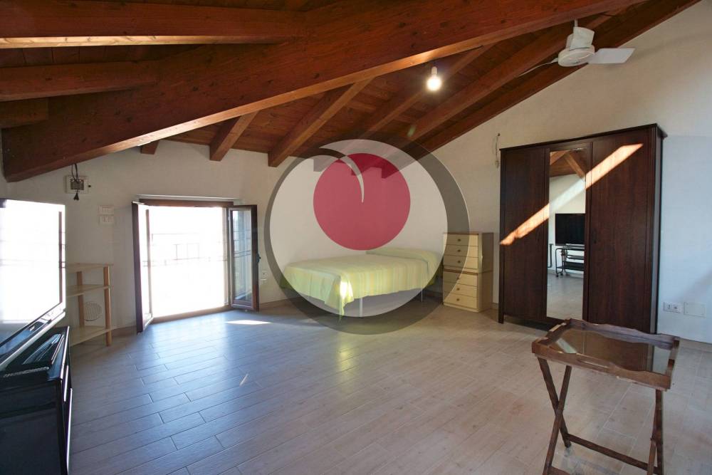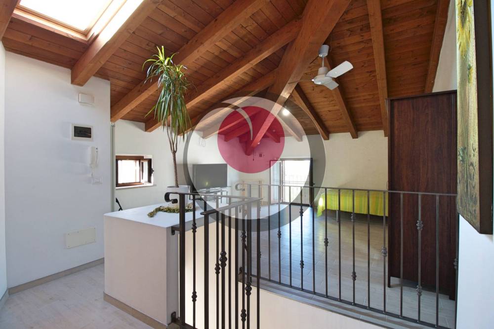 Appartamento duplex al primo piano (90mq): patio esterno con ingresso, disimpegno, soggiorno con cucina a vista e affaccio su balcone, camera matrimoniale e bagno. Al piano superiore, mansarda con ampio open space, camera matrimoniale e bagno.