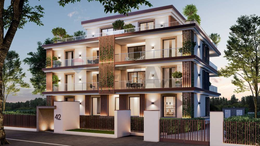 una grande zona living aperta e luminosa che dialoga con lesterno, una zona notte composta da due camere due bagni e due disimpegni rendono questa soluzione abitativa estremamente funzionale ed elegante.