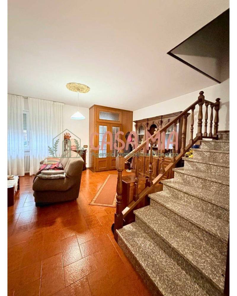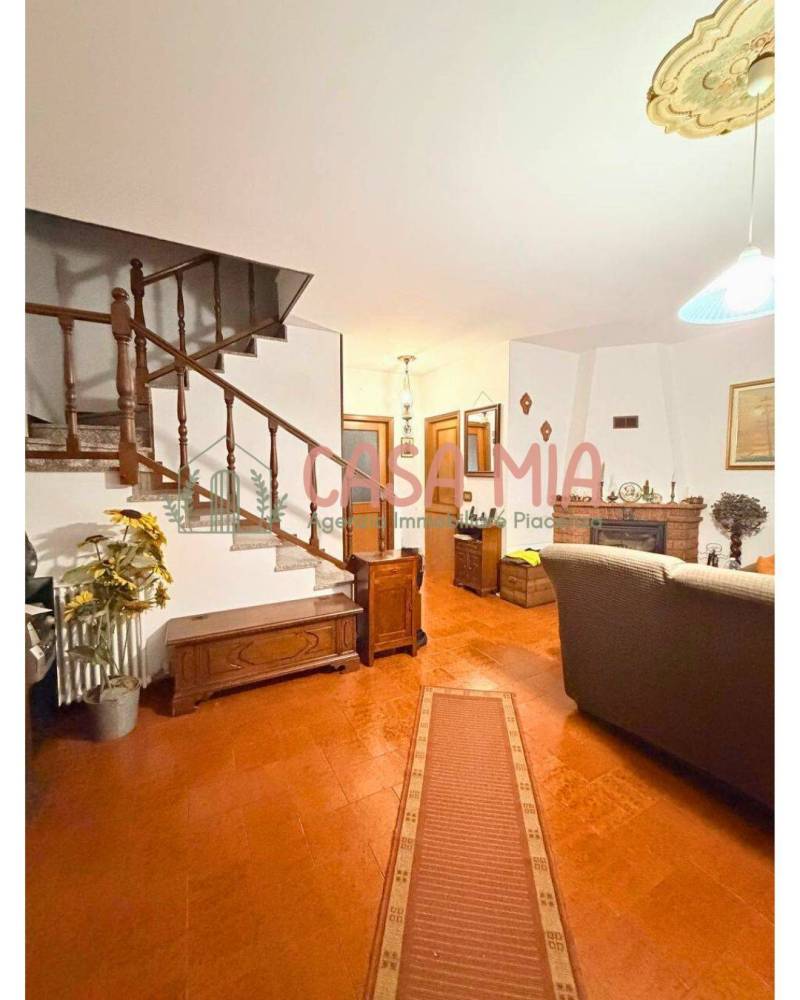 SAN NICOLO': Villa a schiera di fine anni '80 composta da ingresso nel soggiorno con camino, bagno di servizio, sala da pranzo con cucina semi abitabile, vano scala interno dal quale al primo piano raggiungiamo 3 camere da letto, servizio con box doccia, mentre al piano semi interrato locale cantina, e box auto doppio.