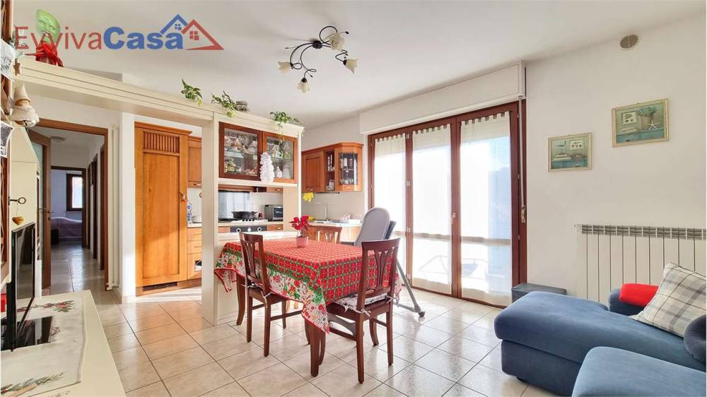 L'ingresso si apre su un soggiorno luminoso con cucina a vista in legno, un ambiente che trasmette accoglienza, dove è facile immaginare la vita di tutti i giorni, i pranzi in famiglia, le serate insieme.