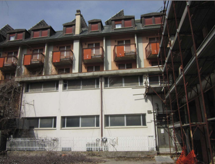 La porzione B costituisce la parte originaria dell'albergo, articolata su più livelli e attualmente in disuso, con ambienti interni e camere oggetto di interventi di ristrutturazione non ultimati.