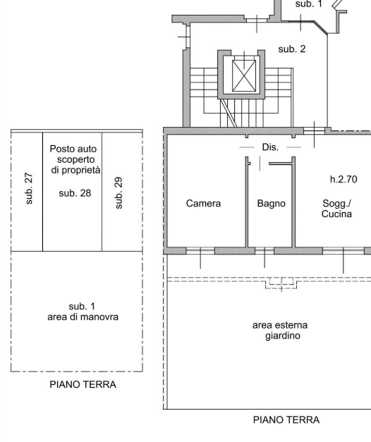 Appartamento al piano terra, bilocale, composto da un ambiente (sala-cucina), un disimpegno, un bagno e una camera da letto matrimoniale.