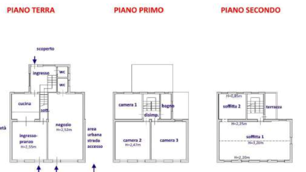 -appartamento con piano terra da ingresso/pranzo, secondo ingresso, cucina e due bagni, al piano primo troviamo tre camere, un bagno, un disimpegno e al piano secondo è presente la soffitta.