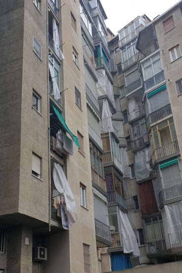 L'immobile è posto al piano sesto ed è cosi composto: ampio ingresso aperto su soggiorno-cucina con piccolo vano uso lavanderia, tre camere, servizio igienico, altro locale dotato di lavabo e doccia, due balconi e cantina al piano interrato.