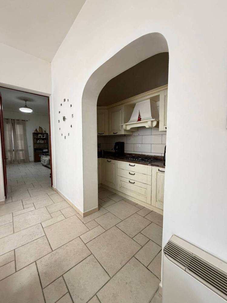 Lingresso conduce a una zona giorno open space con cucina a vista e sala da pranzo, resa particolarmente luminosa dalle ampie superfici finestrate. Il tinello abitabile, separata e funzionale, è collegata alla zona giorno tramite un elegante arco.