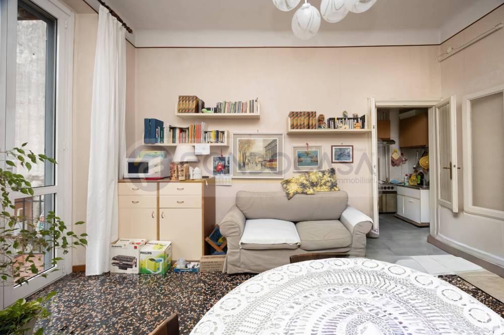 Bilocale di 60 mq, posto ad un primo piano senza ascensore, attualmente composto da ingresso su un ampio disimpegno, un soggiorno con accesso ad un primo balcone, un cucinotto separato, un bagno finestrato ed una camera matrimoniale con accesso al secondo balcone.