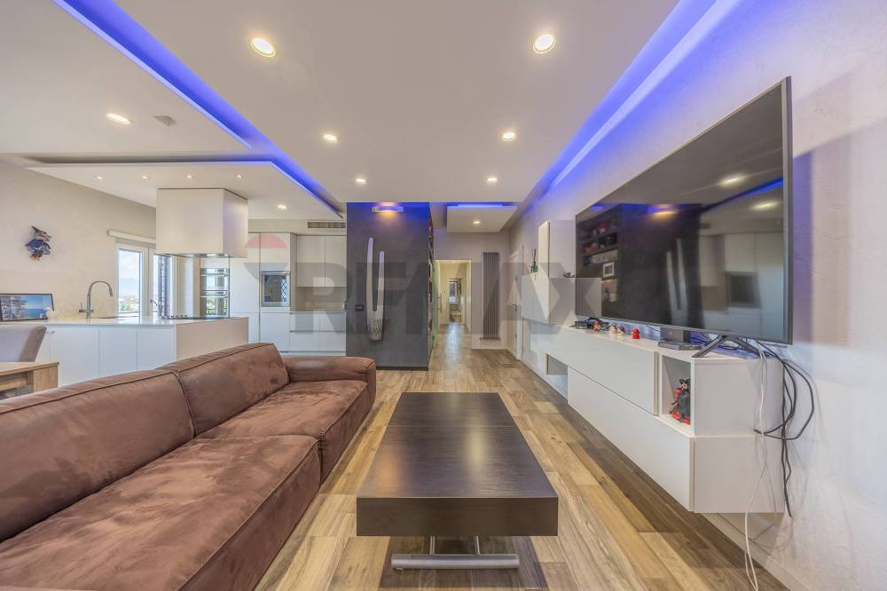 L'immobile, di circa 115 metri quadrati, di cui calpestabili 95 mq interni e 25 esterni, è composto da un ampio e accogliente salone con cucina a vista e isola centrale, due camere da letto spaziose, doppi servizi, ripostiglio e grande balcone perimetrale panoramico, con accesso diretto da ogni ambiente dell'immobile.