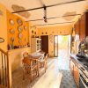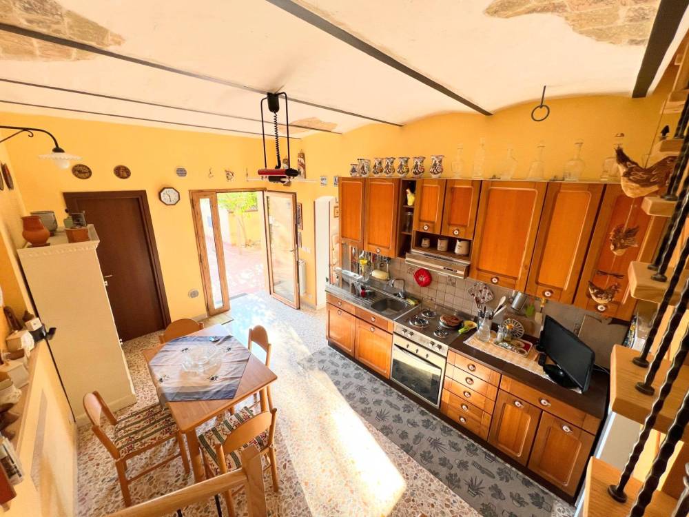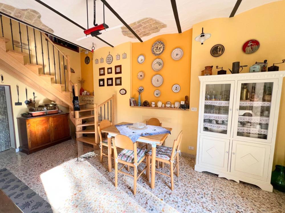'Lingresso si apre sulla zona giorno, dove il camino e la cucina abitabile dialogano con la corte esterna, creando una bella armonia tra dentro e fuori, il piano terra è inoltre servito da un bagno/lavanderia.