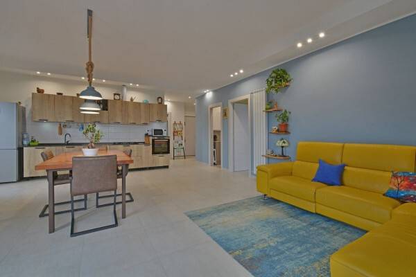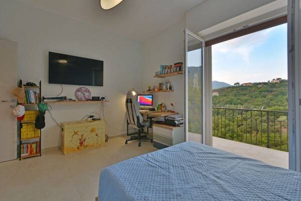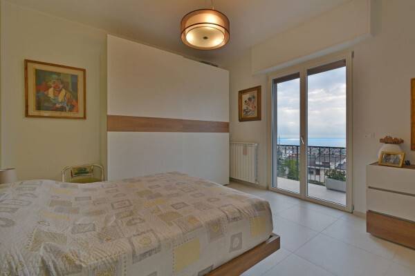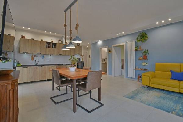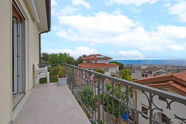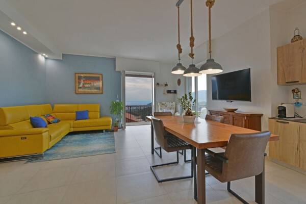 L'immobile è stato finemente ristrutturato e arredato con un gusto moderno che valorizza ogni metro quadrato. Il cuore della casa è l'immenso salone di 40 mq con cucina a vista: un ambiente inondato di luce naturale, ideale per chi ama ricevere ospiti o godersi il relax in famiglia. Ma il vero spettacolo si trova all'esterno: una balconata angolare che regala una vista a 360° che spazia dal blu del mare al profilo delle montagne, oltre a un secondo balcone con vista aperta.