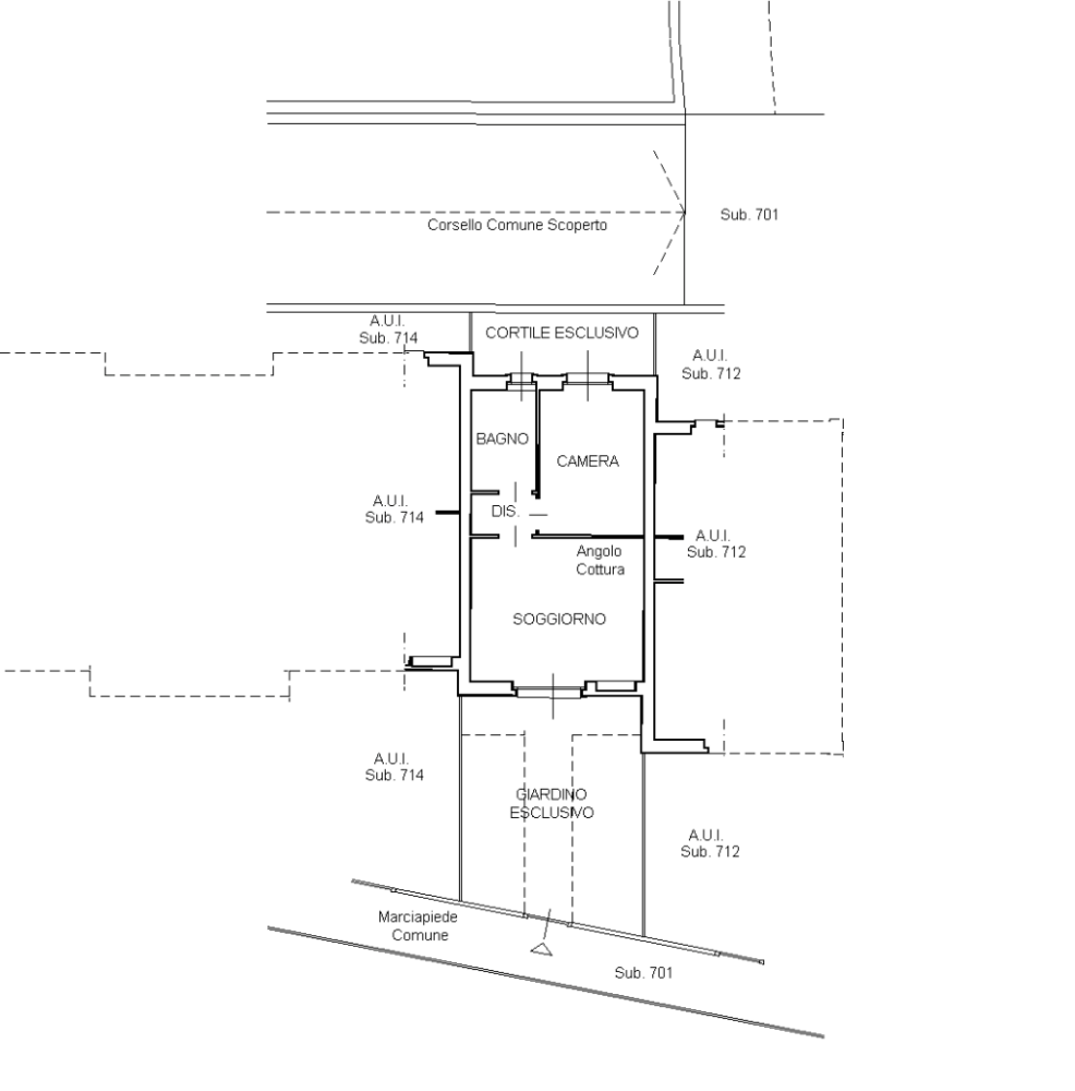 Trattasi di appartamento bilocale al piano terra (catastalmente piano interrato), composto da soggiorno/cucina, disimpegno, camera e bagno, con due aree esterne esclusive.