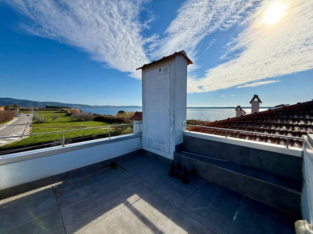 Dal soggiorno, una comoda scala interna conduce a un terrazzo panoramico con suggestiva vista sulla laguna, ideale per momenti di relax allaperto.