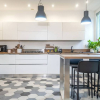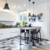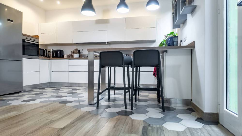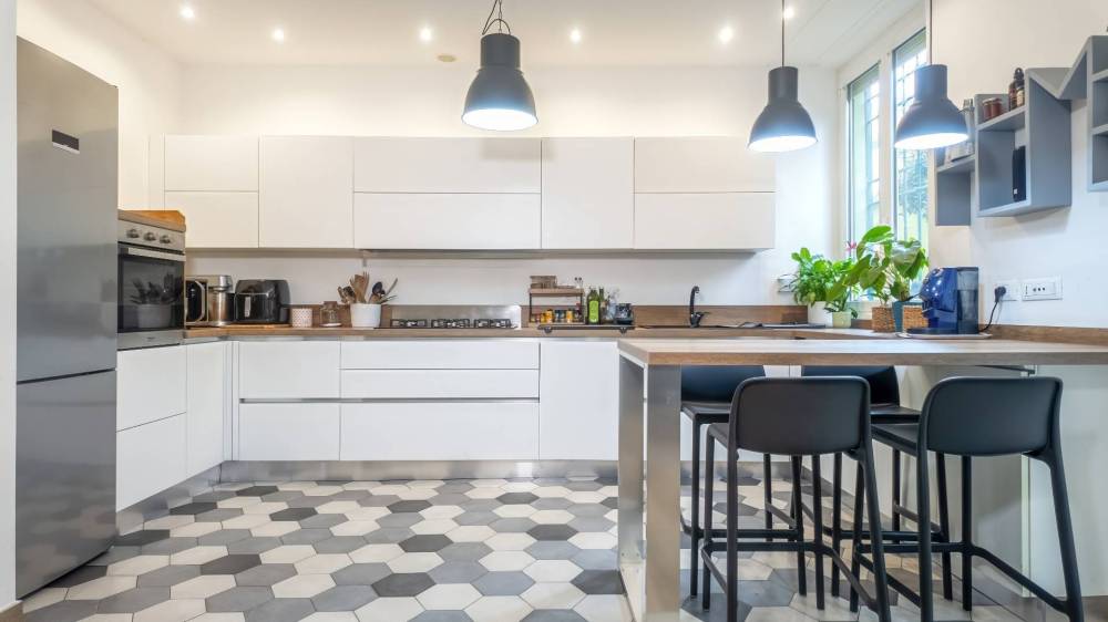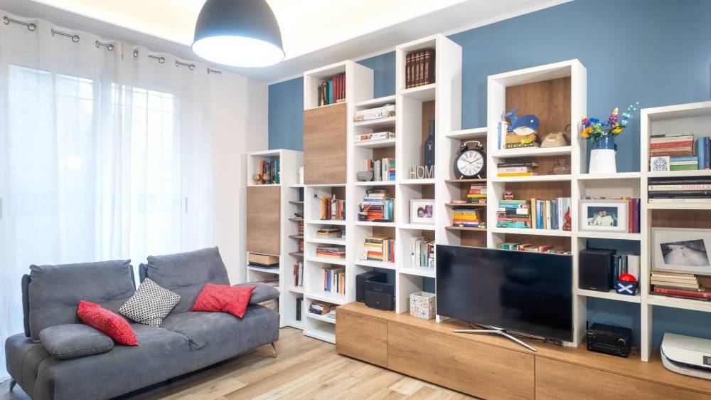 Lingresso conduce a un salone abitabile luminoso, perfettamente integrato con la cucina a vista, creando un ambiente conviviale e contemporaneo.