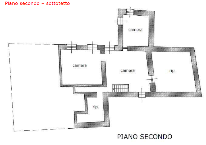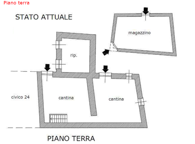 Si sviluppa su tre piani, piano terra, primo, secondo; è dotato di una servitù esterna di pertinenza(collegata al fabbricato) che si sviluppa sulla fascia di terreno sottostante la strada.