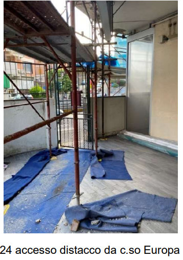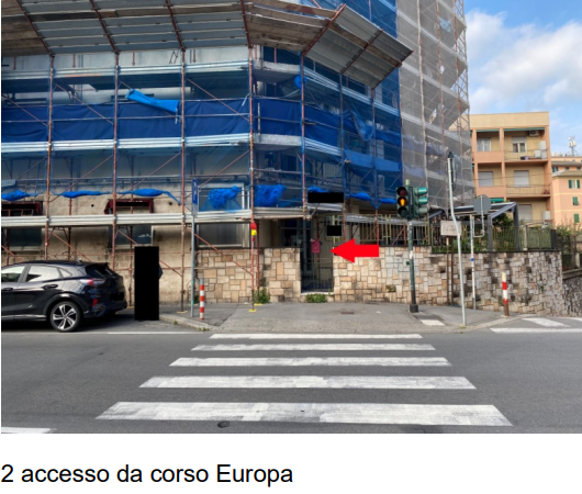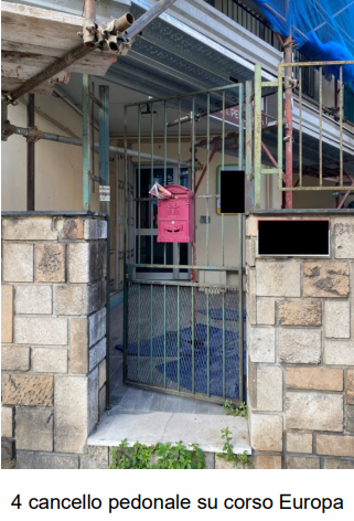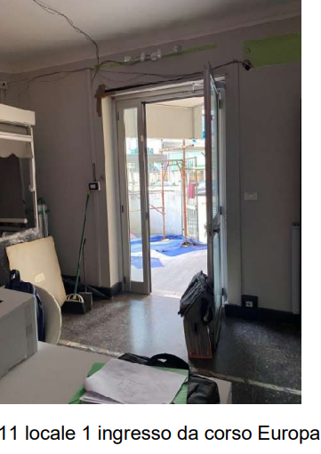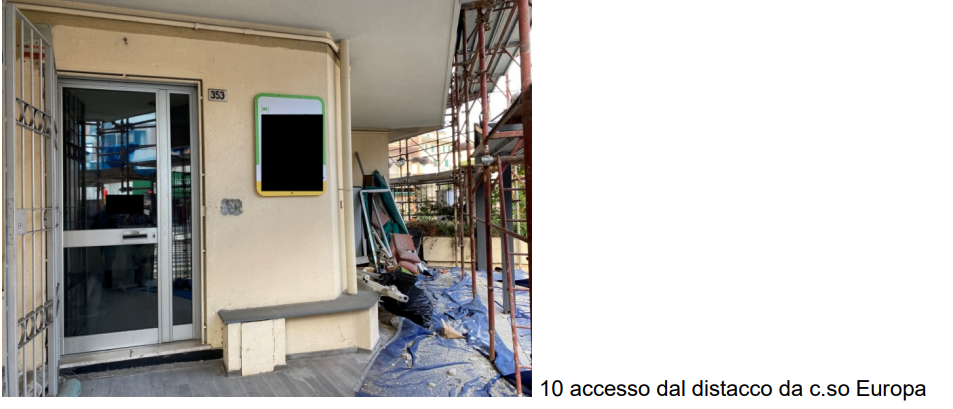 Gli accessi, come detto, sono due, uno comune dal vano scala del c.n.4 e uno indipendente da corso Europa c.n.353 tramite il distacco annesso. Non esistono vere e proprie vetrine su strada ma finestre su corso Europa e portefinestre sul distacco annesso.